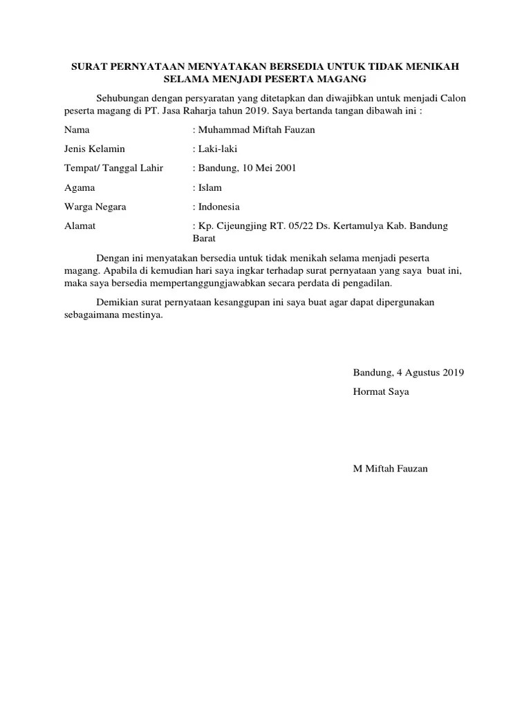 Selain itu, surat ini dapat dijadikan dasar hukum di muka persidangan. Tidak berstatus menikah selama masa pelatihan kurang lebih 1 tahun. Melalui kontrak terciptalah perikatan atau hubungan hukum yang menimbulkan. 6th maret 2021 11 min read. Contoh surat pernyataan kesanggupan tidak menikah selama kontrak. Selama masa magang pihak kedua wajib mengikuti ketentuan jam kerja dan ketentuan umum yang berlaku. Contoh surat permohonan magang advokat atau pengacara. Perjanjian secara lisan jaman sekarang banyak orang yang tidak mau menjalani, mereka harus menggunakan surat pernyataan yang jelas, selain itu para pencari surat perjanjian. Contoh surat perjanjian yang baik dan benar dapat kamu gunakan sebagai referensi dalam menyusunnya. Surat perjanjian saat ini menjadi salah satu surat penting yang digunakan sebagai bukti adanya perjanjian antara satu orang dengan orang yang lainnya. Tekacia machinery jaya adalah selama waktu yang tidak ditentukan. Berikut ini adalah cuplikan isi surat pernyataan bersedia tidak menikah selama magang di jasa raharja terbaru menyatakan untuk tidak akan menikah selama menjadi peserta magang di pt jasa raharja. Saat ini tidak sedang hamil dan tidak akan mengajukan cuti selama 1 (satu) tahun terhitung sejak spmt.